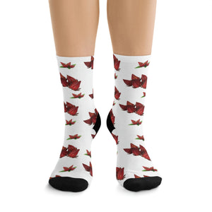 These DTG socks are made using a proprietary blend of yarns specially sourced by Tribe Socks. They are 200 needle knit crew made from 58% Recycled Polyester 22% Nylon 15% Cotton and 5% Elastane. They are a true one size fits most, and are available up to size 12 Men's (U.S.). These socks have an unprecedented amount of stretch with durable print quality.